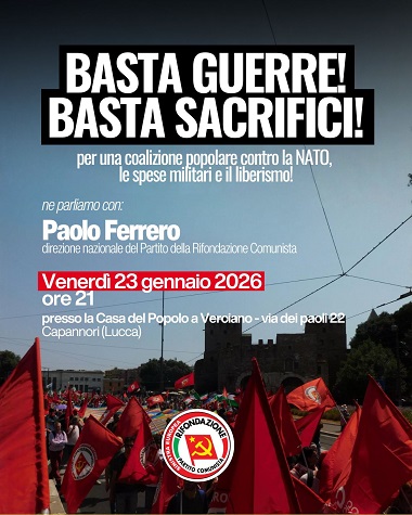 Venerdì 23 alle ore 21.00 presso la Casa del Popolo di Verciano la Federazione di Lucca del Partito della Rifondazione Comunista organizza l'iniziativa "Basta guerra! Basta sacrifici! Per una coalizione popolare contro la NATO, le spese militari ed il liberismo!"