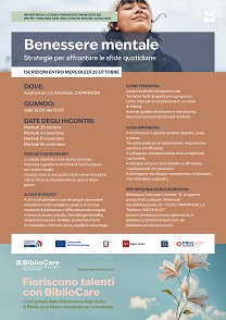 Conto alla rovescia per l'avvio del corso gratuito «Benessere mentale: strategie per affrontare le sfide quotidiane», realizzato nell'ambito dei corsi Bibliocare e che si terrà a Capannori, all'Auditorium di Artemiasia: il corso, infatti, inizia il prossimo 28 ottobre e ci si può iscrivere fino al 22 ottobre.