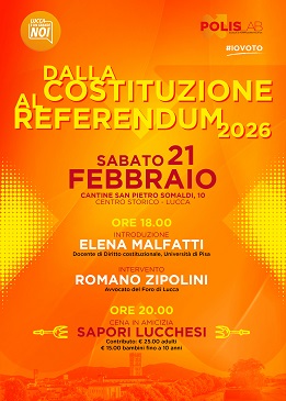 In un tempo in cui la comunicazione politica appare sempre più aggressiva e polarizzante, con il rischio di allontanare i cittadini dalla partecipazione e dal voto, l'associazione Lucca è un grande noi promuove un momento pubblico di riflessione e dialogo dal titolo "Dalla Costituzione al Referendum 2026", in programma sabato 21 febbraio alle ore 18.00 nelle cantine Carmassi di Piazza San Pietro Somaldi,10  in centro storico a Lucca.