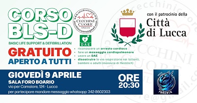 Il Comune di Lucca patrocina e promuove il corso gratuito di BLS-D (Basic Life Support & Defibrillation) organizzato da Cecchini Cuore ONLUS, un'importante iniziativa rivolta a tutta la cittadinanza con l'obiettivo di diffondere competenze fondamentali per il primo soccorso.