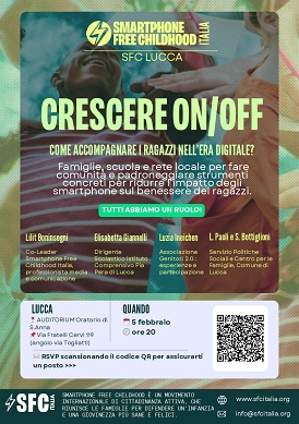 La community di Lucca di Smartphone Free Childhood Italia (SFC) invita genitori, educatori e cittadini all’incontro pubblico “Crescere on/off | Come accompagnare i ragazzi nell’era digitale?”, in programma giovedì 5 febbraio 2026 alle ore 20 presso l’Oratorio di Sant’Anna.