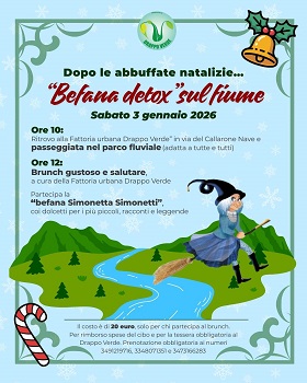 Appuntamento sabato mattina prossimo (3 gennaio): ritrovo alle ore 10 alla Fattoria Urbana sul fiume a Nave (via del Callarone), e passeggiata nel parco fluviale, adatta a tutte e tutti. E a seguire, alle 12, un brunch gustoso e salutare nei locali della Fattoria, in compagnia di una Befana speciale: Simonetta Simonetti.