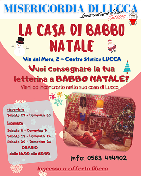 Apre domani, sabato 29 novembre alle ore 16.00, “La casa di Babbo Natale” in Via del Moro, presso i locali dell’ex fiera di beneficenza della Misericordia di Lucca. I volontari dell’Arciconfraternita, come oramai di consuetudine per ogni natale, hanno allestito di tutto punto una gradevole location natalizia, dove i bambini potranno consegnare la propria letterina direttamente a Babbo Natale in persona, e durante l’attesa potranno parlare con gli elfi e colorare disegni natalizi. “La casa di Babbo Natale” sarà aperta tutti i sabati e domenica pomeriggio fino al prossimo 21 dicembre compreso dalle ore 16 alle 20. Per ogni informazione, telefonare al 0583.494902. Ingresso a offerta libera.