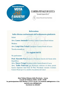 Lunedi 23 febbraio dalle 16 alle 19 la Camera Penale di Lucca ha organizzato un convegno informativo alla sala Tobino Palazzo Ducale Lucca. Si invita tutta la cittadinanza a partecipare per ascoltare le ragioni del SÌ spiegate dal nostro concittadino Senatore Pera che tanto ha dato a questa riforma e che tanto ha dato alla città di Lucca e dal Prof. Tullio Padovani giurista e maestro indiscusso di diritto penale e che è addirittura presidente onorario del comitato per il SÌ dell’ Unione delle Camere Penali Italiane. L’evento sarà presentato dal tesoriere dell’ Unione delle Camere Penali Italiane avv. Laura Antonelli e sarà moderato dall’Avv. Luigi Gino Velani della Camera Penale di Lucca.