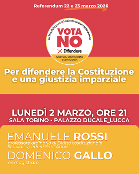 Prosegue il percorso di informazione e partecipazione organizzato dal comitato lucchese Società civile per il no al Referendum costituzionale sulla magistratura previsto per il 22 e 23 marzo 2026. Dopo il successo degli appuntamenti dei giorni scorsi, con centinaia di cittadini e cittadine mobilitate, lunedì 2 marzo in Sala Tobino, a Palazzo Ducale si terrà una nuova iniziativa dal titolo "Per difendere la Costituzione e una giustizia imparziale".