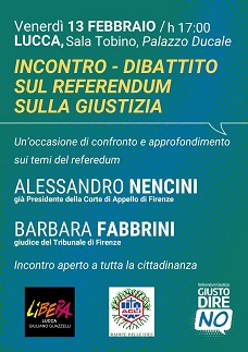 Venerdì 13 febbraio 2026, alle ore 17:00, la Sala Tobino di Palazzo Ducale a Lucca ospiterà un incontro-dibattito pubblico dedicato al prossimo Referendum sulla Giustizia, promosso dal Circolo ACLI "Radice delle Idee" e da Libera – Presidio di Lucca "Giuliano Guazzelli".