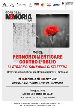 Sabato 14 febbraio alle ore 11, al Museo Athena sarà inaugurata la mostra 'Per non dimenticare contro l'oblio- La strage di Sant'Anna di Stazzema'. In mostra le opere degli studenti del Berufskolleg Ost Der Stadt Essen.