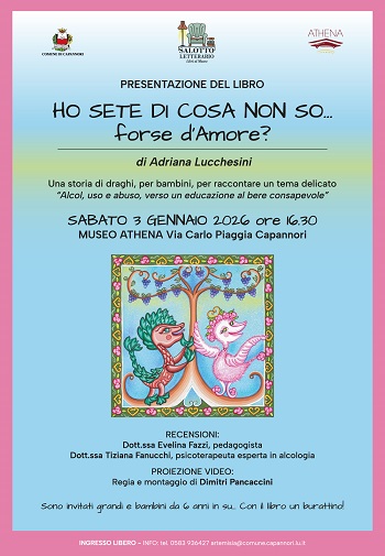 Domani, sabato 3 gennaio, alle ore 16.30, al Museo Athena di Via Carlo Piaggia è in programma la presentazione del libro 'Ho sete di cosa non so...forse d'Amore?' di Adriana Lucchesini.