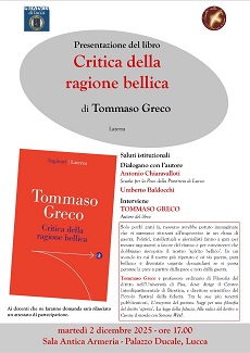 «Critica della ragione bellica» di Tommaso Greco (ed. Laterza) è al centro dell'incontro a Palazzo Ducale (Sala Antica Armeria), in programma martedì 2 dicembre alle 17, organizzato dalla Provincia di Lucca e dalla Scuola per la Pace della Provincia. Dopo i saluti istituzionali, l'incontro proseguirà con un dialogo tra Antonio Chiaravallotti della Scuola per la Pace, Umberto Baldocchi e l'autore del volume, Tommaso Greco per approfondire i temi affrontati da Greco nel suo lavoro.