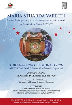 Venerdì 5 dicembre, alle ore 10.30, nello spazio espositivo del Palazzo Comunale in piazza Aldo Moro, si terrà l'inaugurazione della mostra di disegni eseguiti da Maria Stuarda Varetti per la stampa di biglietti natalizi, a cura dell'associazione culturale Ponte con il patrocinio del Comune.