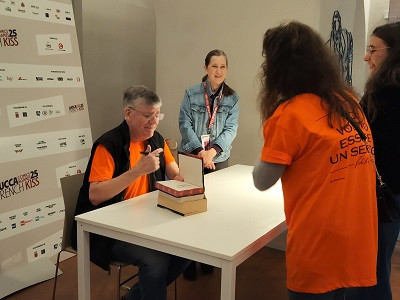 Si sono conclusi i firmacopie al Lucca Comics & Games per Rick Riordan, celebre scrittore statunitense conosciuto in tutto il mondo per la saga “Percy Jackson e gli dei dell'Olimpo”, nella giornata di domenica 2 novembre. In questa edizione 2025, migliaia di fans hanno potuto incontrare l'autore per una sessione di firme dei propri libri, ed hanno potuto scattare una foto in sua compagnia dopo un veloce scambio di saluti e ringraziamenti. Al firmacopie è stato possibile accedere solo con il braccialetto, recuperabile a seguito dell'acquisto di almeno un libro dello scrittore. La fila di fronte allo Stand Mondadori, tuttavia, non è mai stata breve, e non tutti coloro che si sono presentati per la compera del braccialetto sono riusciti ad ottenerlo, sebbene siano rimasti più ore ad attendere di fronte al padiglione in Piazza san Martino. Questo imprevisto è stato la conseguenza dell’esaurimento delle scorte distribuite di tutte le copie dei libri dell'autore, che però ha accolto i più fortunati con gentilezza e affabilità eccezionali. Solare e cordiale con tutti, “Zio Rick”, soprannome conferitogli dai giovani fans, si è reso disponibile ad autografare non solo libri, ma anche merchandising, come le magliette del ‘Campo Mezzosangue’, luogo fittizio dei celebri libri dell'autore. “Percy Jackson e gli dei dell'Olimpo”, “Eroi dell'Olimpo” e “Le sfide di Apollo” sono solo alcuni dei titoli delle saghe fantasy più apprezzate dello scrittore texano che, per la prima volta, si è recato qui in Italia a promuovere due delle sue novità editoriali di quest'anno. "La corte dei morti", scritto con Mark Oshiro ed uscito il 23 settembre, e l'edizione deluxe di "Percy Jackson e gli dei dell'Olimpo", pubblicata il 7 ottobre, offrono ancora una volta, a tutti i fan di Rick Riordan, la possibilità di vivere le avventure dei protagonisti di uno dei fandoms mitologici più apprezzati di tutti i tempi. “The Kane Chronicles” e “Magnus Chase e gli dei di Asgard” compongono parte della bibliografia dell'autore, che da vent'anni ha scalato le classifiche, vendendo più di 190 milioni di copie nel mondo. Dopo la trasposizione cinematografica dei primi due volumi di “Percy Jackson e gli dell’Olimpo”, la saga è diventata una serie Disney+ di enorme successo, che ha reso lo scrittore sempre più noto agli occhi di tutti i giovani lettori italiani e mondiali. Per questa 59^ edizione del Lucca Comics & Games, Rick Riordan ha accolto i fans per sei firmacopie, l'ultimo dei quali si è svolto nella tarda mattinata di domenica 2 novembre dalle ore 10.00 alle ore 12.00. Domani, lunedì 3 novembre, l'autore incontrerà i suoi lettori al Teatro Manzoni di Milano, in un evento organizzato in collaborazione con Lucca Comics & Games.