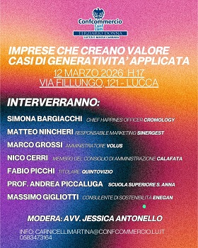 Ci sono le imprese generative e la loro capacità di occuparsi non solo di produrre reddito, ma anche benessere per le persone e la società, al centro dell'importante convegno organizzato dal Gruppo Terziario Donna Confcommercio Lucca Massa Carrara, in programma giovedì 12 marzo alle 17 a Palazzo Sani, sede dell'Associazione. Un interessante momento di confronto promosso dalla presidente del Gruppo Terziario Samanta Cecchi, per discutere di generatività applicata da aziende capaci non solo di fare business e operare sul mercato, ma anche di essere impattanti sul contesto sociale e ambientale che le circonda, abili a riversare benefici e indotto sul territorio di cui fanno parte e producendo così ricchezza per tutta la filiera economica. L'incontro, a ingresso libero per il pubblico, verrà moderato dall'avvocato Jessica Antonello e vedrà la partecipazione e gli interventi da parte dei rappresentanti di vere eccellenze toscane e nazionali come Sinergest, Cromology Italia, Volus, Agricola Calafata, Quinto Vizio ed Enegan Energy Partner, cui si somma la prestigiosa presenza del professor Andrea Piccaluga, docente della Scuola Superiore Sant'Anna di Pisa. Per maggiori info e iscrizioni è possibile rivolgersi alla segreteria organizzativa di Confcommercio (referente Martina Carnicelli –