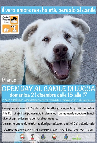 Il Comune di Lucca, attraverso l'assessore alle politiche animali Cristina Consani, insieme all'Osservatorio affari animali, segnala e sostiene l'open day del Canile di Pontetetto, in programma domenica 21 dicembre dalle ore 15 alle 17, presso la struttura di via Santeschi 993 a Pontetetto.