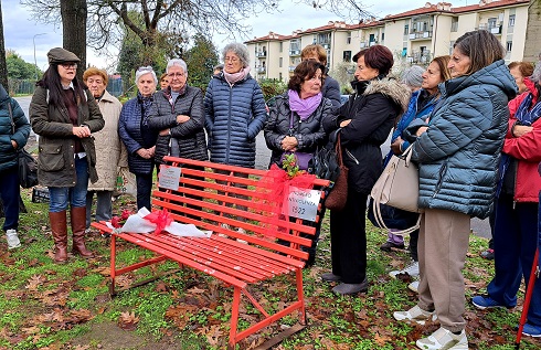 L'iniziativa si è conclusa con la deposizione di un omaggio floreale e la benedizione della panchina rossa da parte di Don Messias Barsella.