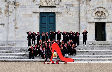 Sempre in mattinata un corteo silenzioso di ragazzi e ragazze, vestiti di nero, ha attraversato via Mazzini con un segno di rossetto sulla guancia, simbolo di solidarietà ma anche di forza e le mani tinte di rosso. In testa al gruppo, una grande sagoma in cartone raffigurante un décolleté dello stesso colore, simbolo universale della lotta contro la violenza di genere. Gli studenti delle classi 3° A e 2° C della scuola media Barsanti, guidati dalle professoresse Ilaria Cipriani e Silvia Baldi e sostenuti dalla dirigente scolastica Maria Teresa Di Leone, hanno allestito davanti alla collegiata di San Martino un'installazione temporanea di scarpe rosse, trasformando la piazza in uno spazio di riflessione: due ragazze hanno recitato la poesia di Shakespeare "In piedi signori davanti a una donna", alternando versi in lingua italiana e inglese, mentre i compagni hanno animato il sagrato con una coreografia che, attraverso gesti e movimenti, ha tradotto le parole in azione. La piccola manifestazione si è conclusa con l'esposizione di alcuni disegni raffiguranti scarpe rosse sull'"Albero dei pensieri", presso lo skate park di via Marconi, a suggellare un percorso simbolico che ha unito giovani, adulti e anziani, uomini e donne, rimarcando come la piaga della violenza non sia "un problema delle donne" ma una responsabilità dell'intera società.
