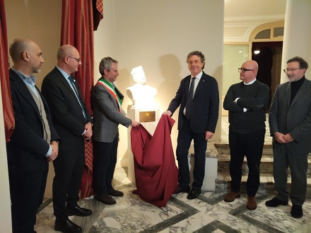 Il busto raffigurante Giacomo Puccini, donato dal “Rotary Club Lucca Giacomo Puccini”, si trova, a partire dal pomeriggio di mercoledì 11 febbraio, nel foyer del Teatro del Giglio Giacomo Puccini. La statua, realizzata in marmo e firmata dall’artista Nicola Domenici, è stata svelata alla cerimonia di inaugurazione delle ore 18.00. A sollevare il velo sono stati il sindaco di Lucca Mario Pardini e l’ex presidente della fondazione Rotary Club Lucca Andrea Boni. “Quando, poco più di un anno fa – ha dichiarato quest’ultimo - il nostro socio Giuseppe Altomare, artista nazionale ed internazionale, venne a proporci l’iniziativa di poter fare un concerto all’interno del Teatro del Giglio Giacomo Puccini, ci siamo subito innamorati di questa proposta. Abbiamo poi deciso di collaborare anche a questo progetto, nel quale hanno preso parte attiva tanti nostri soci, dall’artista Domenici a chi si è procurato il marmo. Una quota discreta del ricavato della donazione è stata destinata ad un service importante per un’associazione lucchese che si occupa dell’attività fisica degli anziani, le Chiavi d’Oro”. Alla cerimonia erano presenti anche Fulvio Spatarella, direttore generale del Teatro del Giglio, l’attuale presidente del Rotary Club Lucca Alessandro Pachetti ed i membri Paolo Ippolito, Marco Mei ed Emanuele Ninci. L’omaggio al maestro lucchese, in occasione del Centenario della “Turandot” che andò in scena per la prima volta il 25 aprile del 1926 al Teatro della Scala, è stato commentato anche dall’amministratore unico del Teatro del Giglio Giacomo Puccini, Giorgio Angelo Lazzarini: “Bene o male noi siamo un tempio, e nei templi bisogna anche ricordare le grandi figure. Chi entra qui dentro, oltre ad ascoltare la musica, può avere questo tipo di suggestioni anche a livello iconografico, di cui noi andiamo molto fieri”. Infine, ha voluto esprimere la propria soddisfazione l’artista a cui è dovuta la creazione dell’opera marmorea. “È stata una committenza eccezionale – ha quindi concluso la cerimonia Nicola Domenici - perché mi hanno dato carta bianca. E per un artista, avere l’opportunità di esprimersi come vuole, è il massimo. Una volta che ho completato il bozzetto, mi hanno detto subito “Perfetto, puoi andare avanti”. Il marmo è il migliore che si possa trovare alla cave di Pietrasanta e nella zona delle Apuane. Si tratta di un marmo statuario pregiatissimo, e poterlo maneggiare è stato per me un onore, come poter vedere la mia opera esposta qui al Teatro del Giglio Giacomo Puccini”.