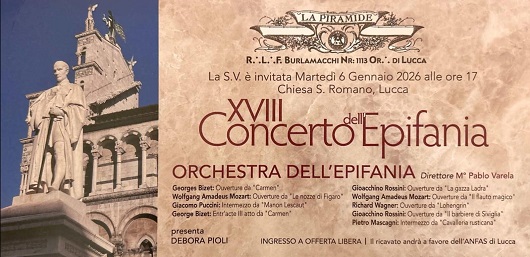 La Massoneria del Grande Oriente d’Italia di Palazzo Giustiniani, fondata nel 1805, opera per l’elevazione morale e spirituale dell’uomo. Anche questo anno la R.L. Francesco Burlamacchi all’Or. di Lucca ha voluto rinnovare la storica tradizione organizzando il XVIII° Concerto dell’Epifania.