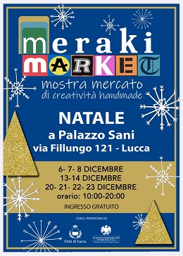 Sabato 20, domenica 21, lunedì 22 e martedì 23 dicembre dalle 10 alle 20, a palazzo Sani si potrà visitare il Meraki Market incontrare gli artisti e creativi "merakiani", con le loro creazioni: dipinti, lavori in pelle, ecopprinting, lavori di cucito e tricot, gioielli in varie tecniche, lavori in legno, riciclo artistico.
