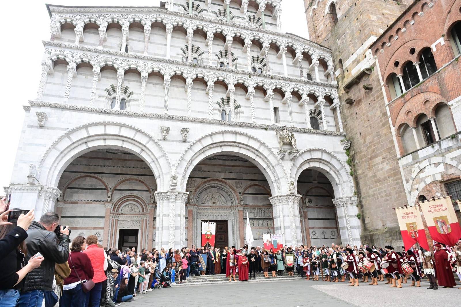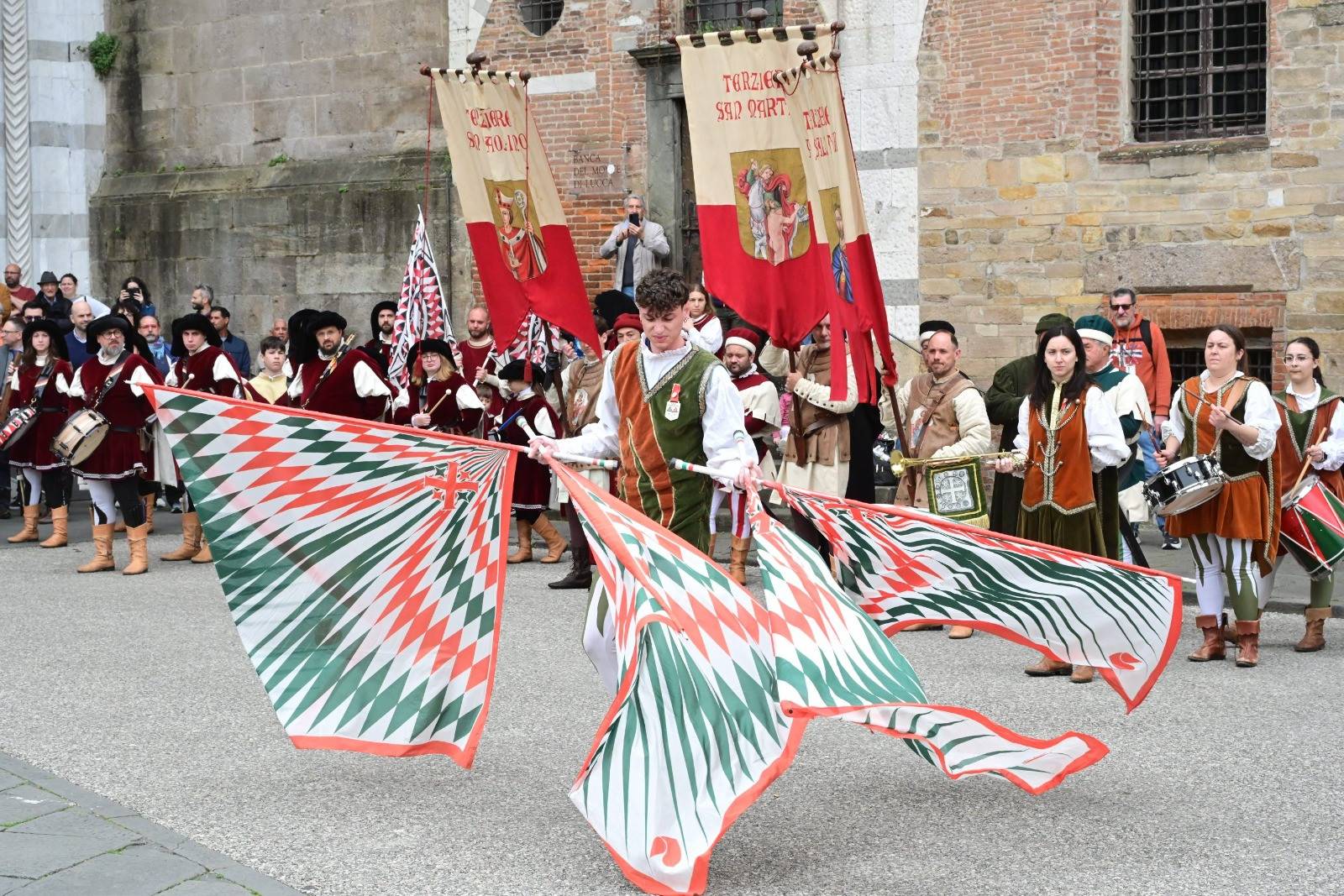 Grande festa in Piazza Napoleone per la parata degli Sbandieratori e Musici Città di Lucca che come ogni anno ha attirato centinaia di spettatori. A concludere la giornata l'iniziativa promossa da Lo Studiorum che nell'auditorium del Cred ha messo in scena un'originale evento tra scherma storica e danze rinascimentali.