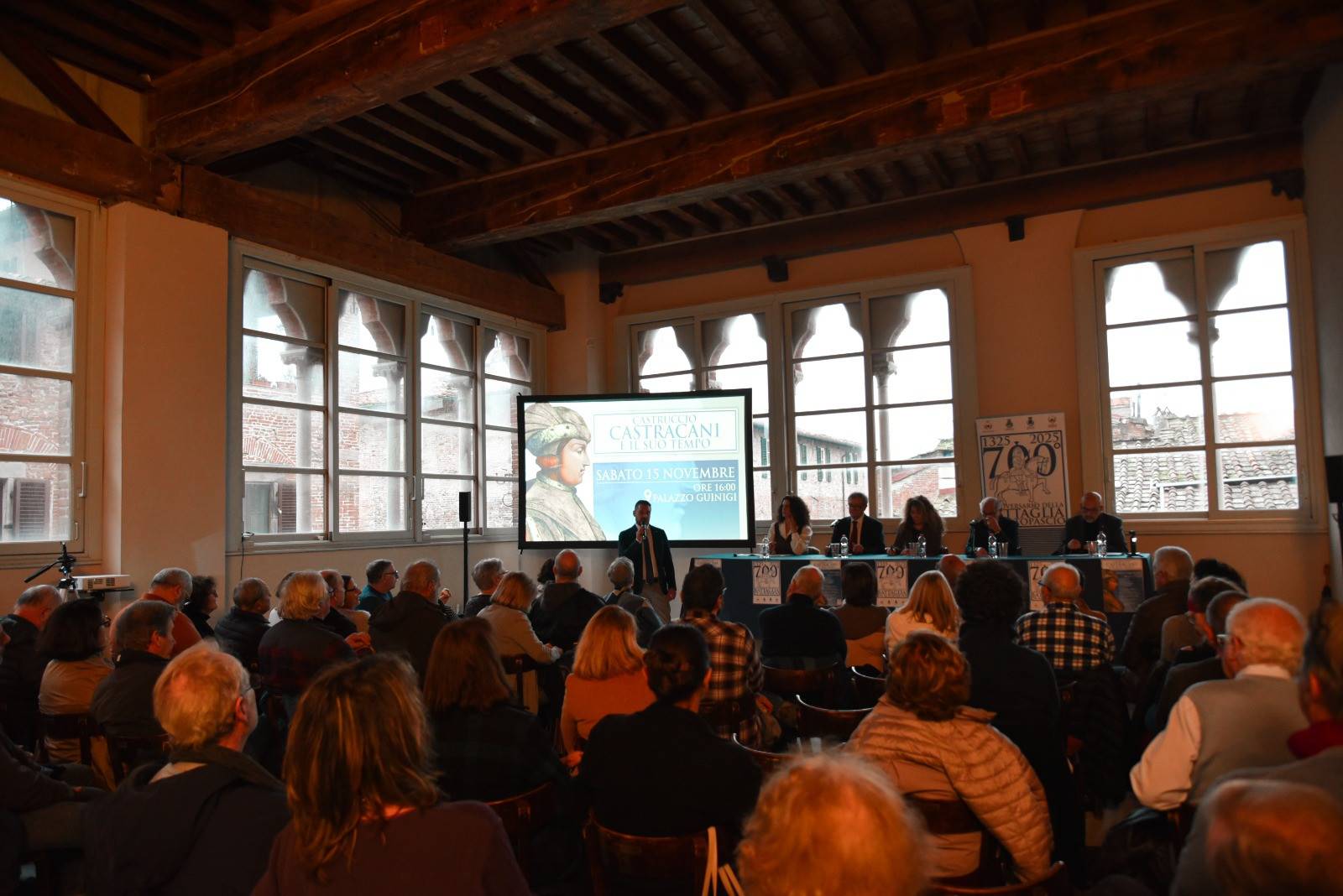 Mario Pardini, dell'assessore alla cultura Mia Pisano e del consigliere con delega alle tradizioni storiche Lorenzo Del Barga, moderato dallo storico e giornalista Alessandro Bedini ha visto alcuni dei medievisti italiani che si sono occupati del Trecento confrontarsi recuperando la figura storica di Castruccio e i molti problemi di interpretazione e lettura che ci ha lasciato. Claudio Carpini dell'Università di Firenze ha ricollegato il personaggio lucchese al complesso tessuto storico italiano del periodo che vede vede il culmine e il declino del sistema comunale italiano dove iniziano a formarsi realtà regionali più vaste. Romina Brugioni dell'Istituto Storico Lucchese ha inquadrato giuridicamente l'eccezionale elezione del condottiero a grande feudatario ereditario dell'Impero con il titolo di duca di Lucca, un riconoscimento inedito e precocissimo nella storia della penisola che si è ripetuto solo raramente e molto più tardi. Isabella Gagliardi ha descritto la società cittadina fra XIII e XIV secolo e i rapporti con la Chiesa che si scontrò violentemente con Castruccio con scomuniche che gravarono per lunghi anni anche sulla città di Lucca. Infine Raffaele Savigni con la Vita Castruccii di Nicolao Tegrimi ha dato una lettura storiografica del rapporto dei Lucchesi con il Castracani e con la sua fama 'ingombrante' per una città di lunga tradizione repubblicana; attraverso la biografia scritta da uno degli umanisti più colti e pubblicata nuovamente nel '700 si comprende come i cittadini seppero superare le contraddizioni e le divisioni di parte trecentesche per appropriarsi degli aspetti più positivi e innovativi di questo personaggio che viaggiò fra le comunità lucchesi in Europa e in Inghilterra apprese l'arte della guerra più moderna nelle Fiandre e concepì un entità regionale alternativa a Firenze in Italia.