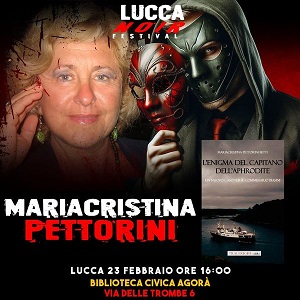Presso l’auditorium della Biblioteca civica Agorà di Lucca, in via delle Trombe, 6 - nell’ambito delle manifestazioni del “ Festival Lucca Noir ” , sarà presentato il nuovo romanzo giallo poliziesco di Mariacristina Pettorini “L’enigma del Capitano dell’Aphrodite”. L’appuntamento è per venerdì 23 febbraio, alle 16. L’evento sarà coordinato dal Dott. Andrea Giannasi della Tralerighe Editrice. “l’Enigma del Capitano dell’Aphrodite”, è il secondo caso che si presenta all’investigatore altoatesino Manfred Biasini, per metà anche di origine toscana, che dirige la Squadra Mobile di Bolzano e la sezione reati contro le persone , coadiuvato da uomini e donne di diverse regioni italiane, con i loro tic e le loro virtù.
