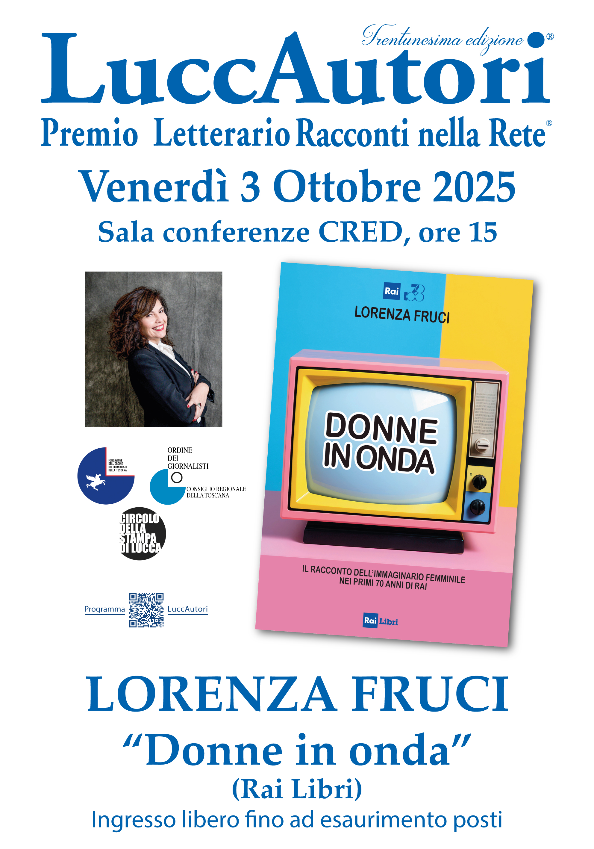 Intervengono Anna Benedetto, segretaria del Consiglio di disciplina dell'Ordine dei Giornalisti della Toscana, Demetrio Brandi, presidente di LuccAutori e del premio Racconti nella Rete, e Maria Elena Marchini, conduttrice degli incontri del festival.