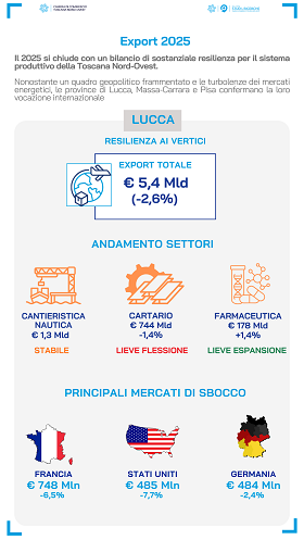 Nel 2025, dopo il record dell'anno precedente, l'export della provincia di Lucca ha registrato un fisiologico ridimensionamento, attestandosi a 5 miliardi e 398 milioni di euro (-2,6%) ma comunque su livelli storicamente molto elevati. La cantieristica nautica ha confermato il proprio ruolo di traino, mantenendo invariate vendite per circa 1 miliardo e 300 milioni di euro di esportazioni (invariata rispetto al 2024). Segnali più deboli sono emersi invece nel comparto cartario e cartotecnico: gli articoli di carta e cartone sono scesi a 744 milioni di euro (-1,4%), mentre la pasta-carta si è attestata a 455 milioni (-5%), per un totale di circa 1,2 miliardi (-2,8%). Ancora più marcata la contrazione per la meccanica legata al cartario (-9,9%, 578 milioni di euro), e per l'olio, calato a 291 milioni (-20,1%). Più contenute le variazioni negli altri settori manifatturieri: le macchine di impiego generale sono cresciute a 145 milioni di euro (+4,6%), stabili invece le apparecchiature di cablaggio a 320 milioni (+0,7%) e in lieve espansione la farmaceutica (178 milioni; +1,4%). Le imprese lucchesi confermano un solido presidio sui principali mercati di riferimento, seppur in flessione: la Francia si mantiene primo partner (circa 748 milioni di euro, -6,5%), seguita da Stati Uniti (485 milioni, -7,7%) e Germania (484 milioni, -2,4%). Si osserva inoltre una certa volatilità nei mercati legati alla nautica da diporto: le esportazioni risultano di volta in volta allocate su diverse giurisdizioni di registrazione, come le Isole Cayman — principale registro a livello globale per numero di yacht — e le Isole Marshall, player in crescita, ma di dimensioni più contenute. Un andamento che riflette la variabilità della clientela e delle scelte di registrazione, più che una dinamica di sostituzione, configurandosi come un'alternanza tra destinazioni analoghe sotto il profilo fiscale.