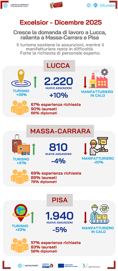 La fotografia del mercato del lavoro di fine anno nelle province di Lucca, Massa-Carrara e Pisa restituisce un quadro in chiaroscuro: da un lato l'occupazione mostra una tenuta nei servizi, grazie al dinamismo del turismo e a una domanda crescente nei comparti della cura alla persona; dall'altro, alcuni settori industriali continuano a soffrire, con ricadute sulle esigenze di personale delle imprese manifatturiere.