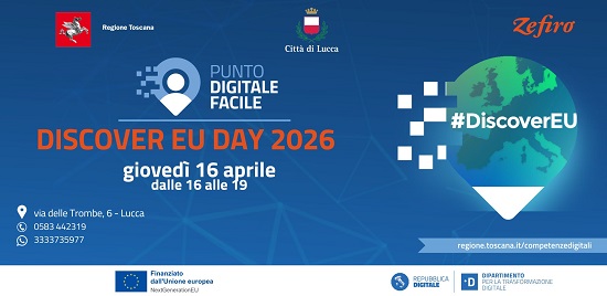 L'Informagiovani del Comune di Lucca apre le porte dell'Europa ai suoi giovani cittadini con un'iniziativa dedicata alla mobilità internazionale e alla scoperta del patrimonio culturale del continente. Giovedì 16 aprile, dalle ore 16:00 alle 19:00, i locali del Punto Digitale Facile in via delle Trombe ospiteranno il "Discover EU Day", un evento informativo e operativo promosso dall'Informagiovani per far conoscere il celebre programma della Commissione Europea che mette a disposizione dei diciottenni migliaia di pass ferroviari rimborsati.