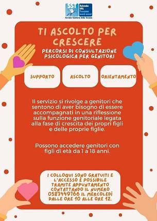 Al servizio di consultazione psicologica breve e focalizzata possono accedere genitori con figli da 1 a 18 anni. I colloqui sono gratuiti e l’accesso è possibile tramite appuntamento contattando il numero 0583.449766 il mercoledì dalle ore 10 alle ore 12.