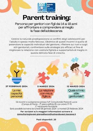 Sono inoltre in programma 3 giornate di Parent training dedicate a genitori con figli dai 14 ai 18 anni. Gli incontri avranno alcuni precisi obiettivi: il potenziamento delle capacità individuali del genitore, la riflessione sui ruoli e sugli stili genitoriali e il confronto sulle strategie più efficaci al fine di migliorare la relazione genitori-figli. Le date previste sono: il 27 febbraio 2024 sul tema “Le mie capacità personali”; il 5 marzo 2024 con argomento “La relazione con mio figlio”; il 12 marzo 2024 con l’incontro dal titolo “Quale è il mio stile genitoriale?”.