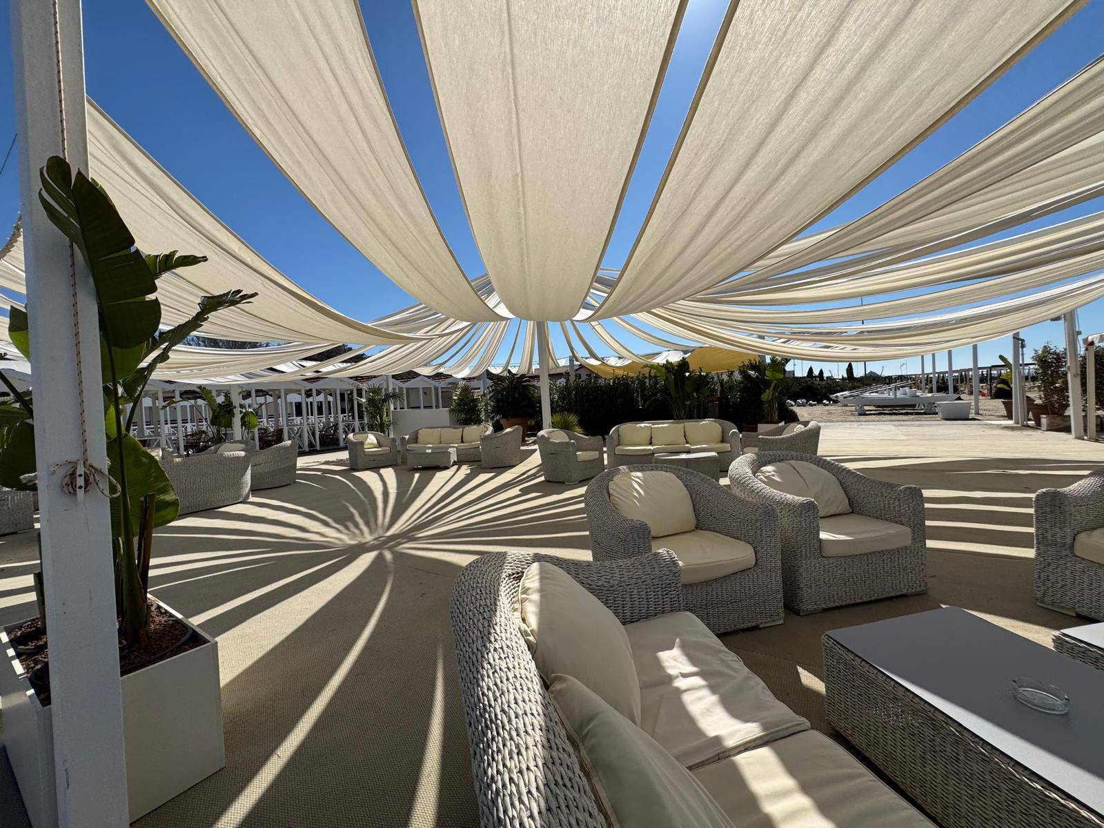 Il pranzo (o la colazione) è servito e il salato la fa da padrone. Il tutto vale davvero la pena. E si chiude con il dolce e la frutta, esotica e non. Poi, per chi ha un po' di tempo per godersi la vita, vista anche la giornata stupenda, attraversamento del tunnel sotto la strada principale che fiancheggia la spiaggia e visita al bagno dell'Augustus e al ristorante favoloso Bambaissa. Gli arredi sulla spiaggia sono fantastici, il bianco ecru su tutto.