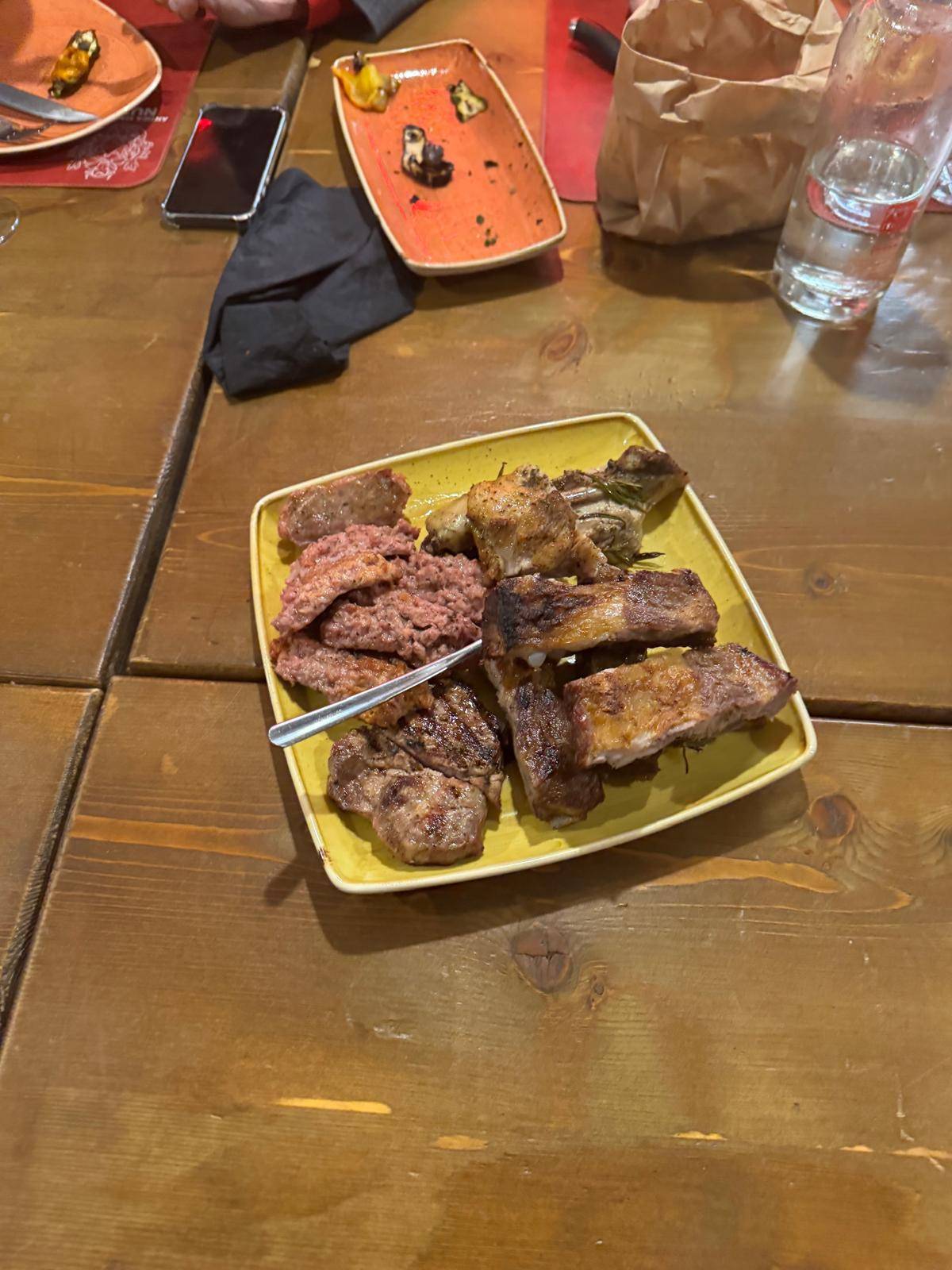 La conviviale dell’Accademia si è trasformata quindi in un vero e proprio viaggio sensoriale. I partecipanti hanno potuto degustare tagli pregiati preparati secondo metodi tradizionali, esaltati da cotture semplici ma rigorose, capaci di valorizzare ogni sfumatura di gusto. Non sono mancati i grandi classici della macelleria toscana, accompagnati da vini del territorio lucchese, un bianco e un nero di Montecarlo, che ne hanno esaltato ulteriormente il carattere. Gli antipasti selezionati con altrettanti affettati di produzione propria con il classico prosciutto bazzone accompagnanti da formaggi, crostini e polenta fritta con ragù immancabilmente di carne proveniente dalla macelleria. A seguire il primo piatto di tortelli sempre e naturalmente al ragù di carne con ripieno anche questa volta di carne. Una grigliata mista ha stimolato, qualora ve ne fosse ancora bisogno, le papille gustative degli esperti commensali. Hanno fatto da padrone, anche se non prodotte in macelleria, le portate che hanno accompagnato le carni, ovvero le ottime patate arrosto e la favolosa grigliata di verdure, sapientemente scelte dallo chef.