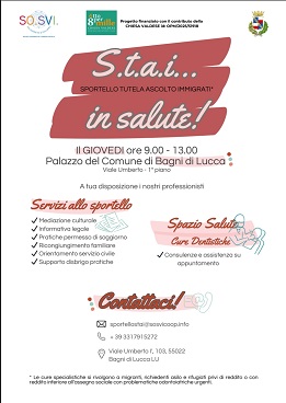 Lo Sportello Tutela e Ascolto Immigrati (S.T.A.I.), ospitato al primo piano del palazzo del Comune di Bagni di Lucca e gestito dagli operatori della Cooperativa Sociale Solidarietà e Sviluppo, si arricchisce di uno Spazio Salute dove ricevere consulenze e assistenza su appuntamento per cure dentistiche grazie al progetto “S.T.A.I… in salute” finanziato con il contributo della Chiesa Valdese id: OPM/2025/51918.