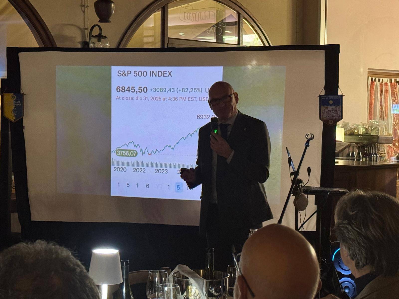 Protagonista della serata è stato il socio del Club Carlo Puccini, consulente finanziario e patrimoniale con qualifica di Private Banker che ha generosamente messo a disposizione e offerto ai presenti un intervento, e non solo, dedicato all’analisi dello scenario economico finanziario contemporaneo. Una vera e propria “lectio magistralis” condotta con professionalità e tecnicismo uniti a una conclamata capacità espositiva e comunicativa. Capacità indiscussa di Carlo che e riuscito a rendere facilmente comprensibili anche ai non addetti ai lavori argomenti complessi e dinamiche di mercato spesso impercettibili e non sufficientemente evidenziate dagli organi comunicativi del main stream.