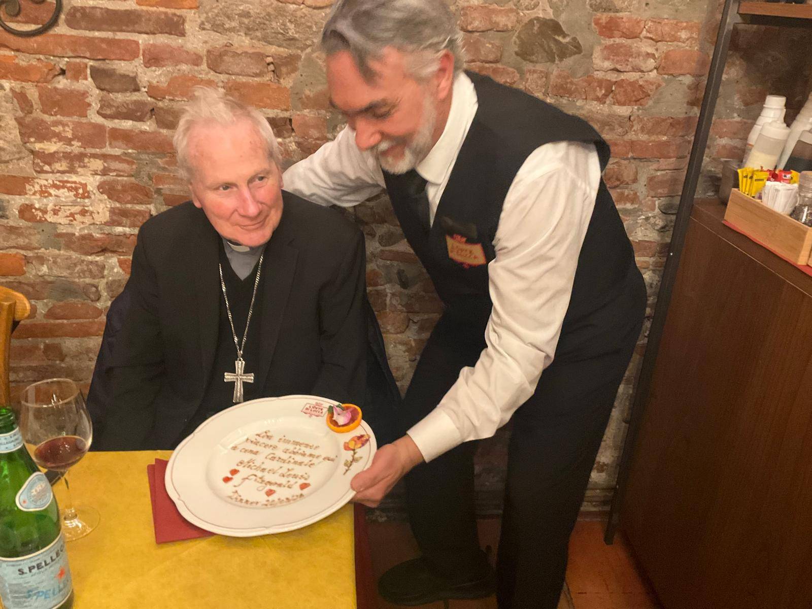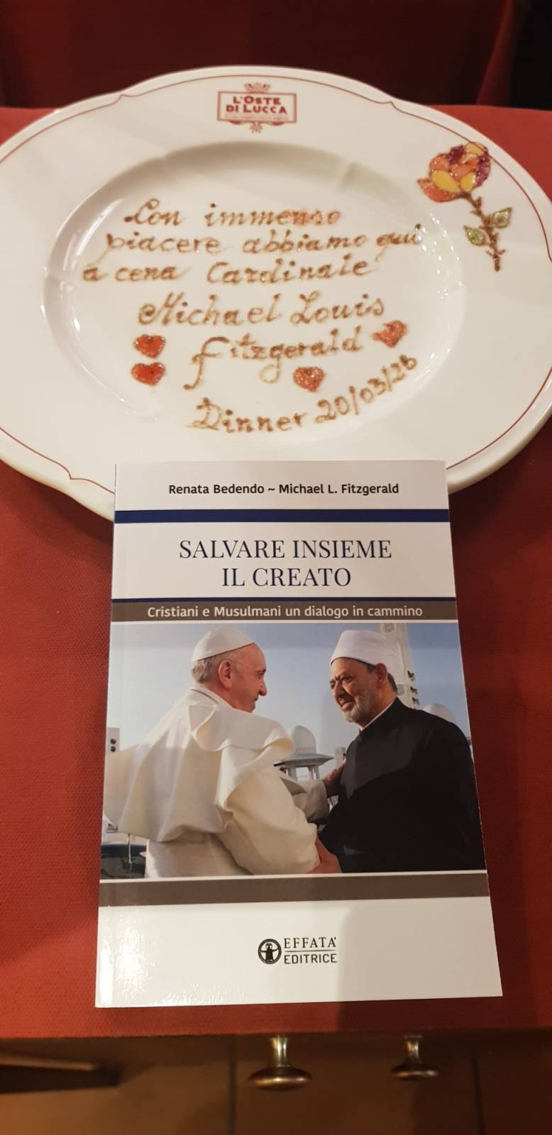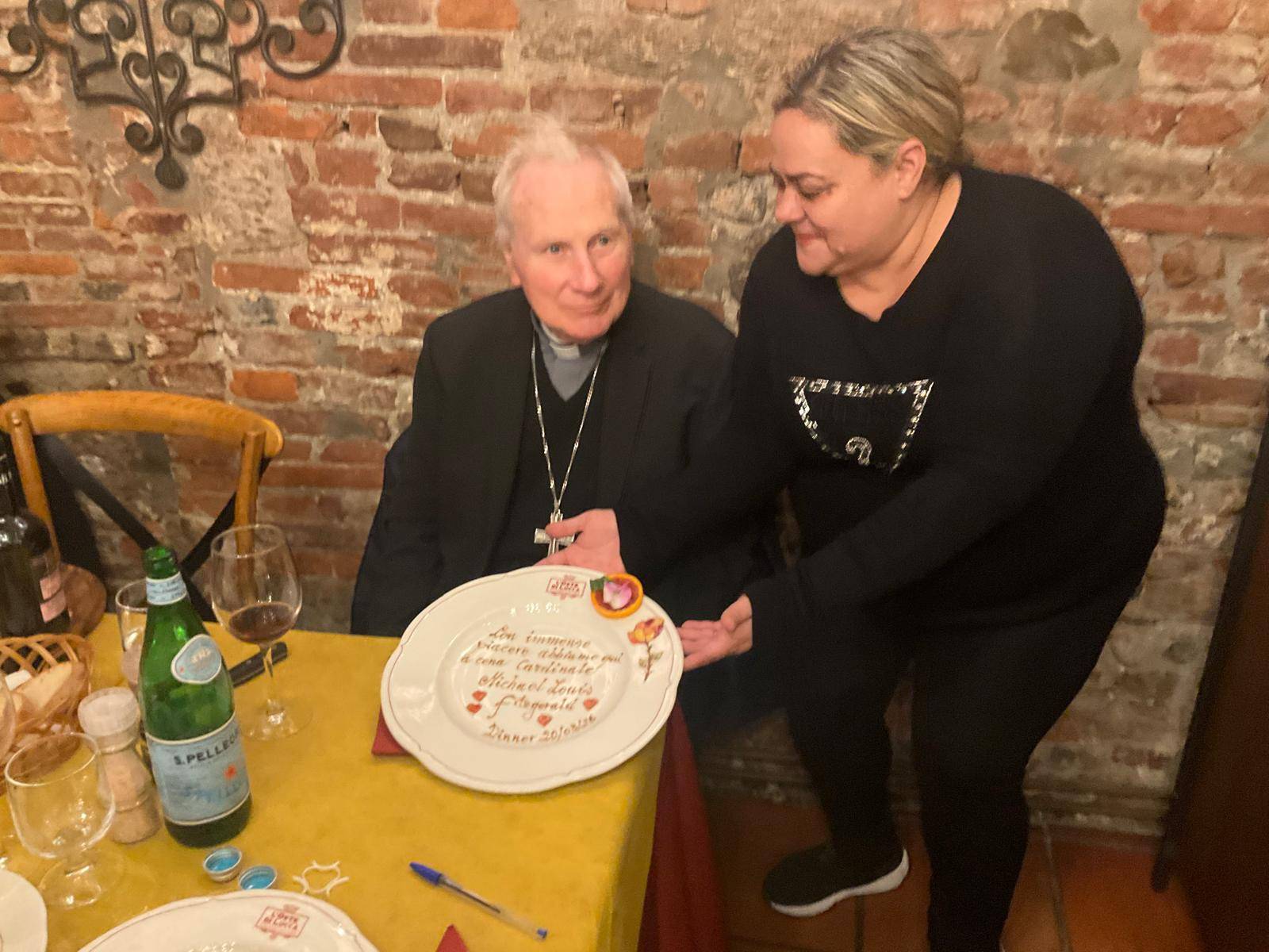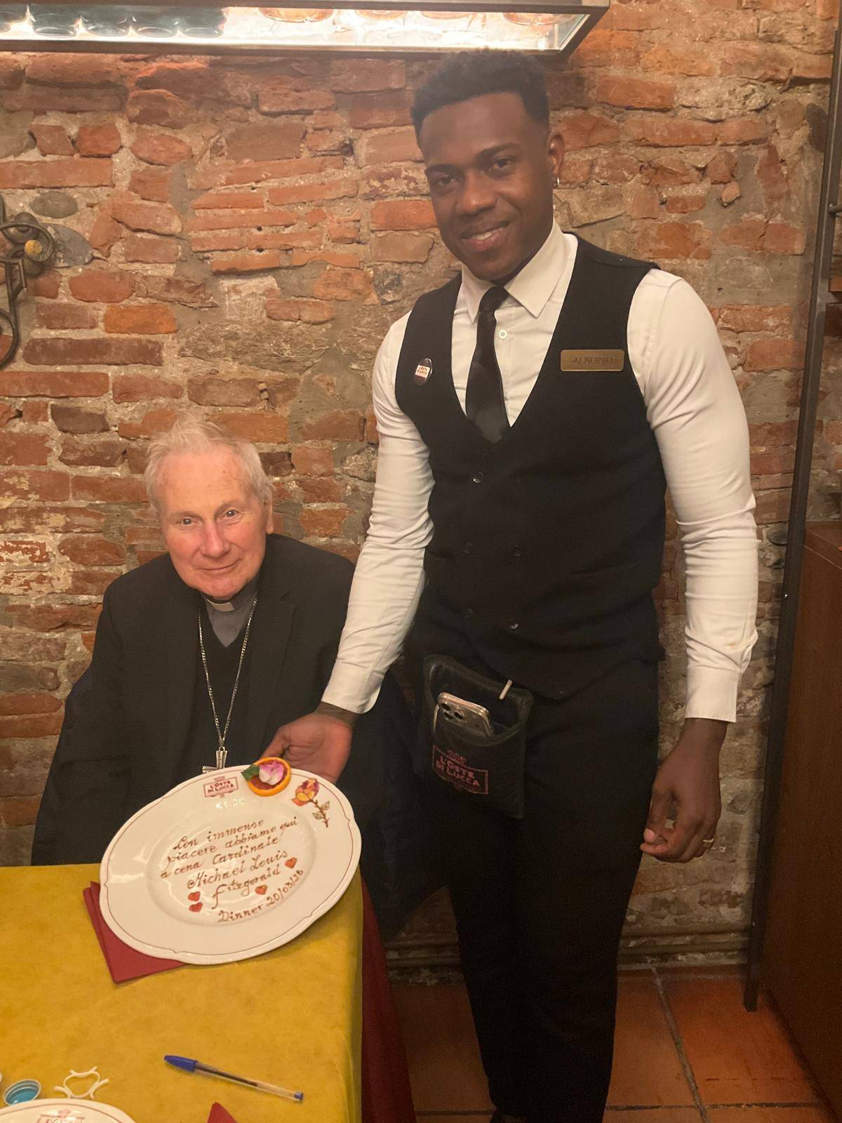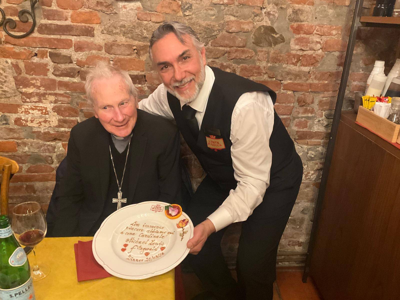 Che sorpresa alcune sere fa al ristorante Oste di Lucca di via Fillungo della famiglia Del Magro. Tra i commensali, infatti, c'era nientepopodimeno che Michael Louis Fitzgerald, cardinale e arcivescovo cattolico britannico, dal 23 ottobre 2012 nunzio apostolico emerito in Egitto. Oltre che ai consueti saluti per un personaggio così rilevante, Vincenzo Botta, responsabile di sala, ha voluto dedicare all'ospite uno dei suoi piatti disegnati al momento con una frase che renda l'idea dell'importanza per il locale di avere un personaggio così illustre. Il cardinale ha presentato a Lucca nell'ambito della settimana di dialogo tra cattolici e musulmani, il libro Salvare insieme il creato - Cristiani e Musulmani un dialogo in cammino scritto dallo stesso cardinale Fitzgerald e da Renata Bedendo.