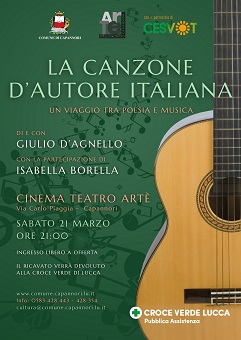 Il grande cantautorato italiano in scena a Capannori: sabato 21 marzo, alle ore 21.00, il Cinema Teatro Artè ospiterà l’evento benefico La Canzone d'Autore Italiana – Un viaggio tra poesia e musica. Lo spettacolo, che vede protagonista il musicista e polistrumentista Giulio D’Agnello, con la partecipazione di Isabella Borella, ha un nobile fine: sostenere le attività sociali della Croce Verde di Lucca.