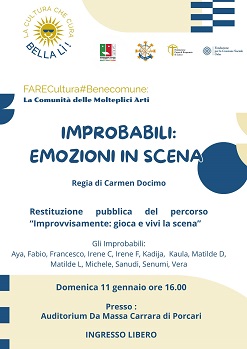 Domenica 11 gennaio alle ore 16.00, all’Auditorium “Vincenzo Da Massa Carrara” di Porcari, appuntamento con “Gli Improbabili: EMOZIONI IN SCENA”, restituzione pubblica dell’esperienza laboratoriale “Improvvisamente: gioca e vivi la scena”, con la regia di Carmen Docimo.