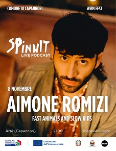Sabato 8 novembre alle ore 21 arriva presso il cinema teatro Artè di Capannori il format Spinnit live podcast con un ospite d'eccezione, Aimone Romizi, già frontman della band Fast Animals and Slow Kids. Durante il talk verranno affrontati temi legati alla musica: cosa significa fare arte in provincia, quali sono le sfide di oggi per i giovani aspiranti artisti. L'evento è presentato dal Comune di Capannori in collaborazione con il festival musicale WØM FEST che, dal 2016, promuove la musica inedita sul territorio della provincia di Lucca e che ha visto esibirsi sui propri palchi artisti del calibro di Lucio Corsi, Gazzelle, La Rappresentante di Lista, POP X, BNKR44, Pino D'Angiò e molti altri.
