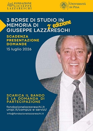 Il bando completo, con il fac-simile della domanda, è reperibile da oggi sul sito della Fondazione Giuseppe Lazzareschi, www.fondazionelazzareschi.it e sul sito dell'Università di Pisa al link https://www.unipi.it/campus-e-servizi/opportunita-e-tempo-libero/premi-e-borse-di-studio/