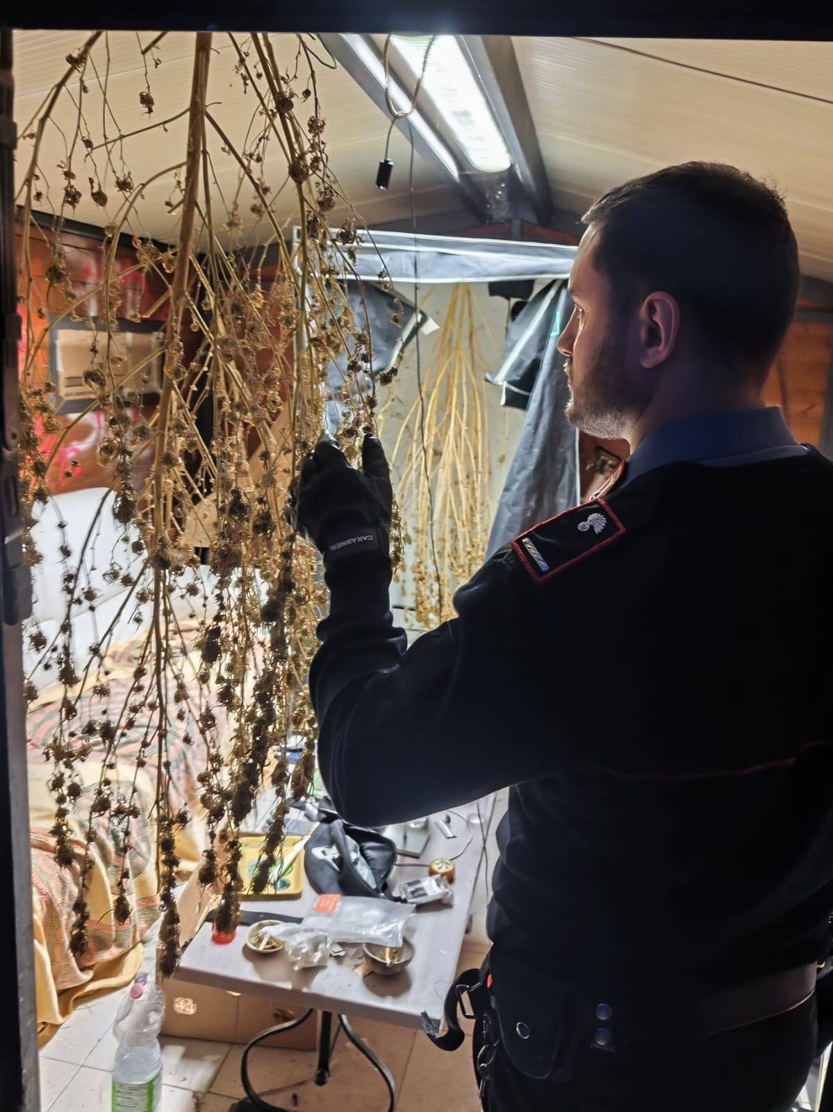 ⦁ un 24enne trovato in possesso di circa 120 grammi di hashish, circa 100 grammi di marijuana, due piante di cannabis indica alte cm. 170 in essiccazione, una serra per la coltivazione e 100,00 euro ritenuti verosimilmente provento delle attività di spaccio.