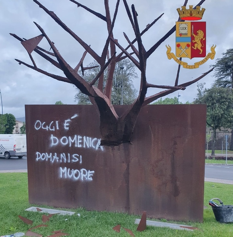 Ho appreso poi dai giornali, on line e non, che a cancellarla la mattina presto era stato lo stesso autore dell’opera, che aveva voluto scriverla sul monumento più di un anno fa; per quale motivo non è dato sapere. Ricordo tra l’altro che l’artista prima di apporre la scritta era già intervenuto sull’opera tagliando le foglie dell’albero, di acciaio corten, che oltrepassa il muro - anch’esso d’acciaio - sul quale è tracciato il planisfero.