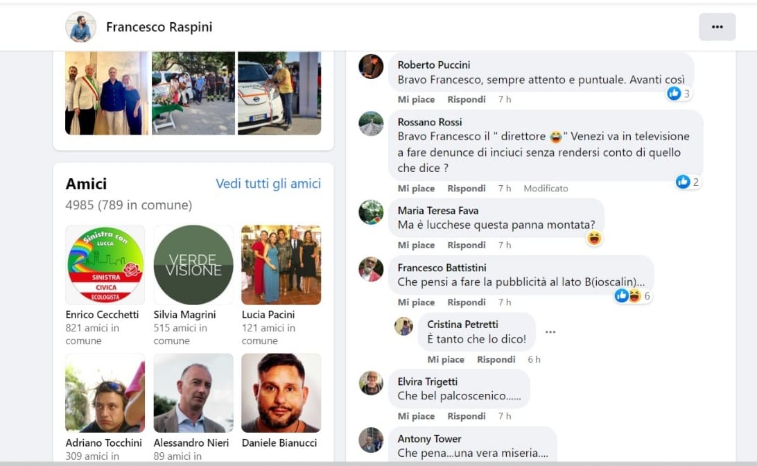 Strano che una persona attenta come Francesco Raspini non si sia accorto dei commenti che pubblichiamo e che non sono davvero edificanti su un profilo come il suo ossia di una persona che voleva diventare sindaco di tutta la città. Si può non essere d'accordo con Venezi su tutto, ma buttarla sulla panna montata come fa una certa Maria Teresa Fava o sul lato B come il Battistini, beh, ci sembra francamente esagerato, ma, soprattutto, di cattivo, cattivissimo gusto.
