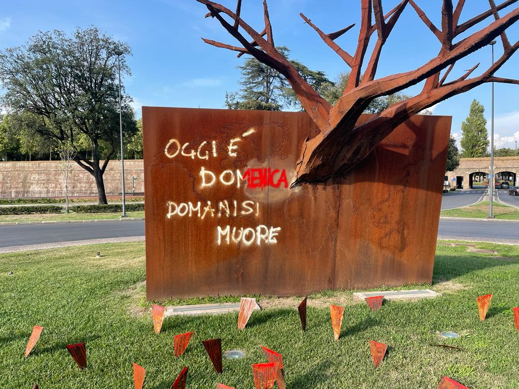 Sì, perché Lucca, ormai, ha il suo monumento Pulp, chi lo avrebbe mai detto? Dopo che l'autore dell'opera finanziata con 80 mila euro dalla Fondazione Carilucca ha infilato le foglie dell'albero di metallo nel prato adiacente il monumento, appare evidente a tutti che si ha a che fare con una persona che definire imprevedibile è un eufemismo. Prima ha deturpato la sua stessa scultura asportando le foglie dai rami e nascondendole oltre a verniciare una scritta senza senso. Ora, nonostante la denuncia, ha aggiunto le foglie grondanti sangue: ma stiamo scherzando?