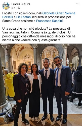 Un equivoco che ha finito per tirare ingiustamente in ballo Francesco Raspini, capo di gabinetto della Provincia ed ex capogruppo del Pd. La forza di opposizione Lucca Futura, infatti, ha pubblicato un post nel quale ha inserito una fotografia scattata durante la processione di S. Croce che ritrae, oltre a tre esponenti della formazione medesima - Olivati, Borselli e Stefani - anche Francesco Raspini. Niente di che, quindi, Poi, però Lucca Futura e i suoi tre consiglieri se la prendono con Roberto Vannacci chiamandolo in causa sia per la sua visita in comune e alla processione sia per i messaggi di odio che diffonderebbe.