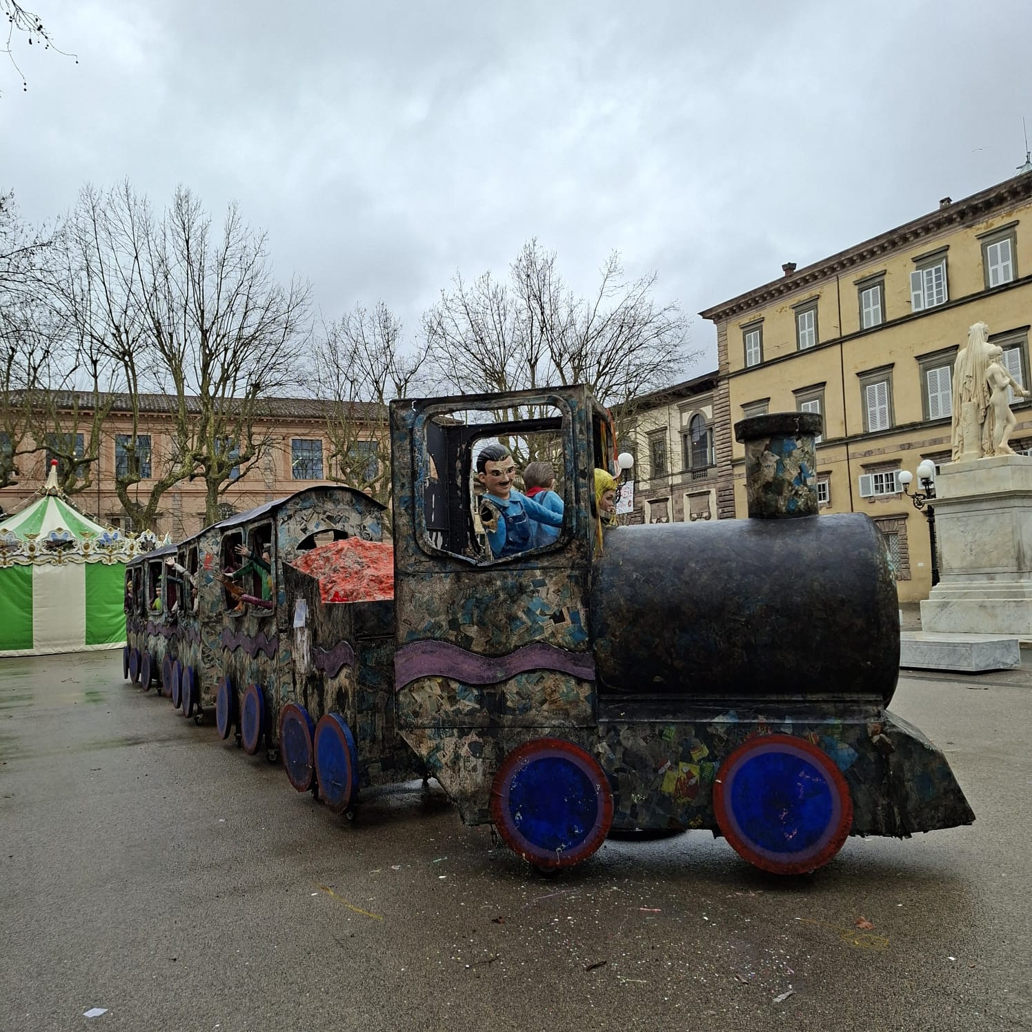 “Il trenino che è stato piazzato lì dal 24 gennaio - e lì resterà fino al 24 febbraio - sta perdendo i pezzi, con effetti tragicomici: i mascheroni perdono mani e braccia, i volti si deformano, voragini si aprono. Un’ironica metafora di un deragliamento culturale causato dall’amministrazione Pardini che purtroppo non si limita alla piazza più centrale della città, ma che coinvolge anche le statue degli equilibristi in via di decomposizione in piazza San Michele”.