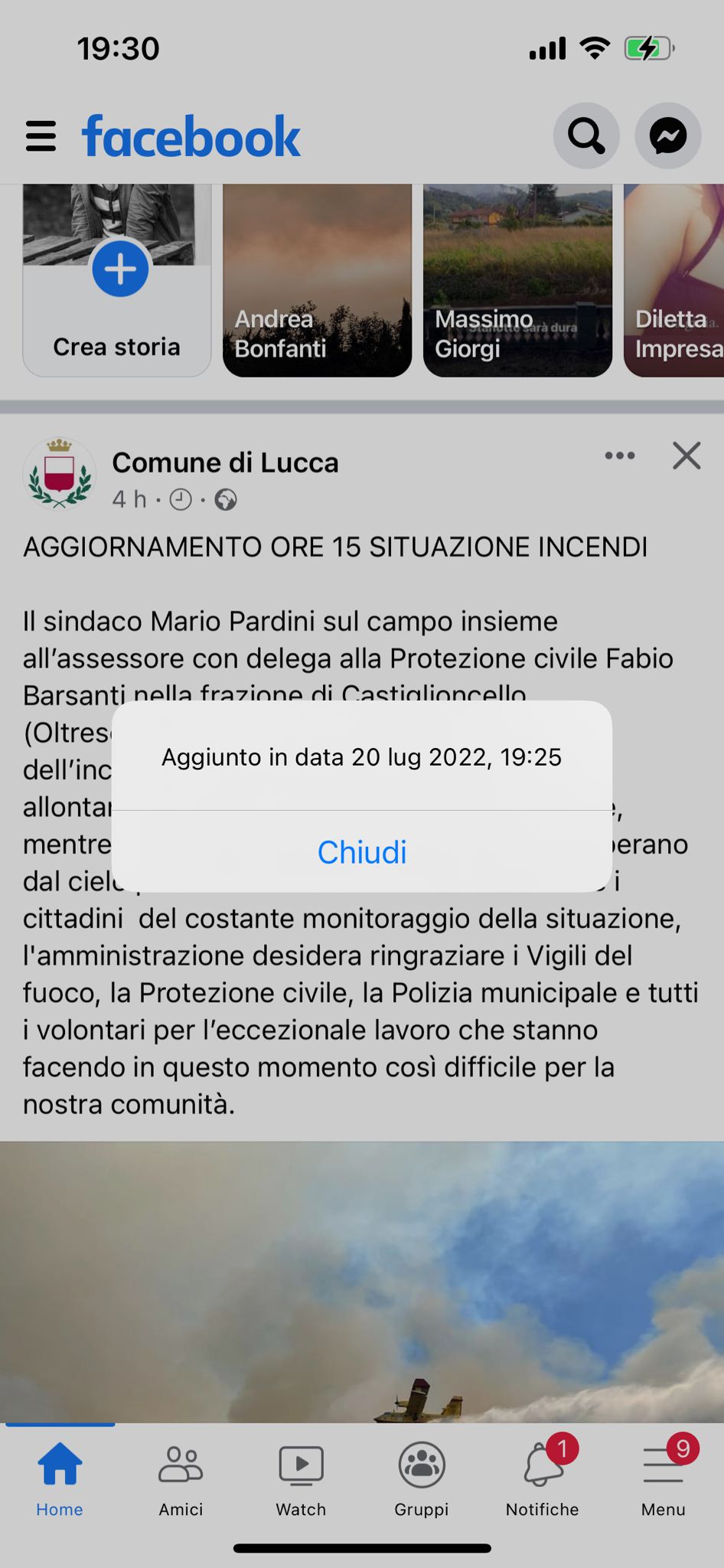 Detto (a Pardini) e fatto: subito, appare intorno alle 19.30 un post che pubblichiamo e che è stato attualmente rimosso chissà perché. Peccato che ad un più attento controllo su Facebook è evidente che esso è stato retrodatato di quattro ore. Al di là di tutto, un errore procedurale anche se il contenuto rispecchia in pieno il comportamento di Mario Pardini e dei componenti della giunta che si sono recati a far visita alle frazioni maggiormente minacciate dalle fiamme dove hanno riscosso consensi per questa visita, se non altro, a testimonianza di una forte vicinanza emotiva.