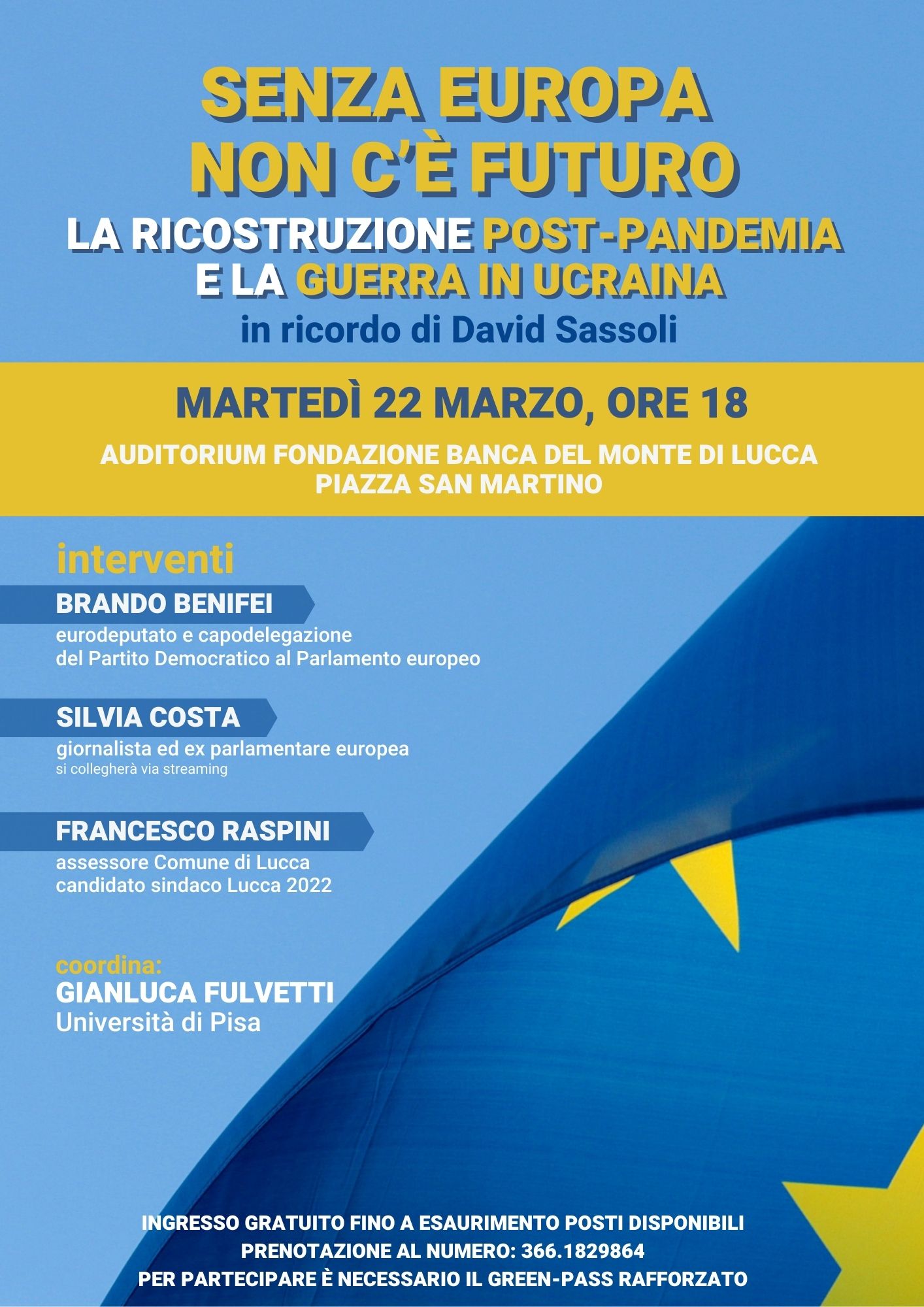 Il conflitto in Ucraina, la ricostruzione post pandemia e, sullo sfondo, il ricordo di David Sassoli, l'ex presidente europeo scomparso più di due mesi fa: quale il ruolo dell'Europa? Quale il futuro del paese? Quali le ragioni che hanno portato al conflitto in Ucraina? Quali le conseguenze e le prospettive future? Domande, temi, analisi che saranno al centro dell'iniziativa "Senza Europa non c'è futuro: la ricostruzione post pandemia e il conflitto in Ucraina", in programma martedì 22 marzo, alle 18 all'auditorium della Fondazione Banca del Monte di Lucca in piazza San Martino.