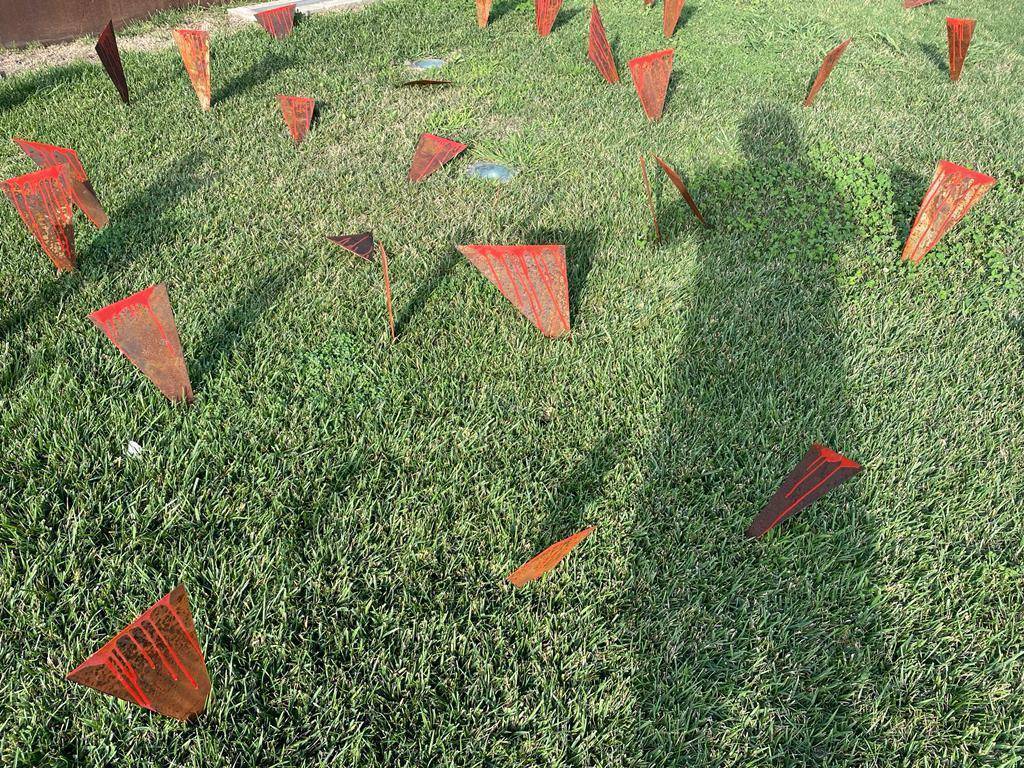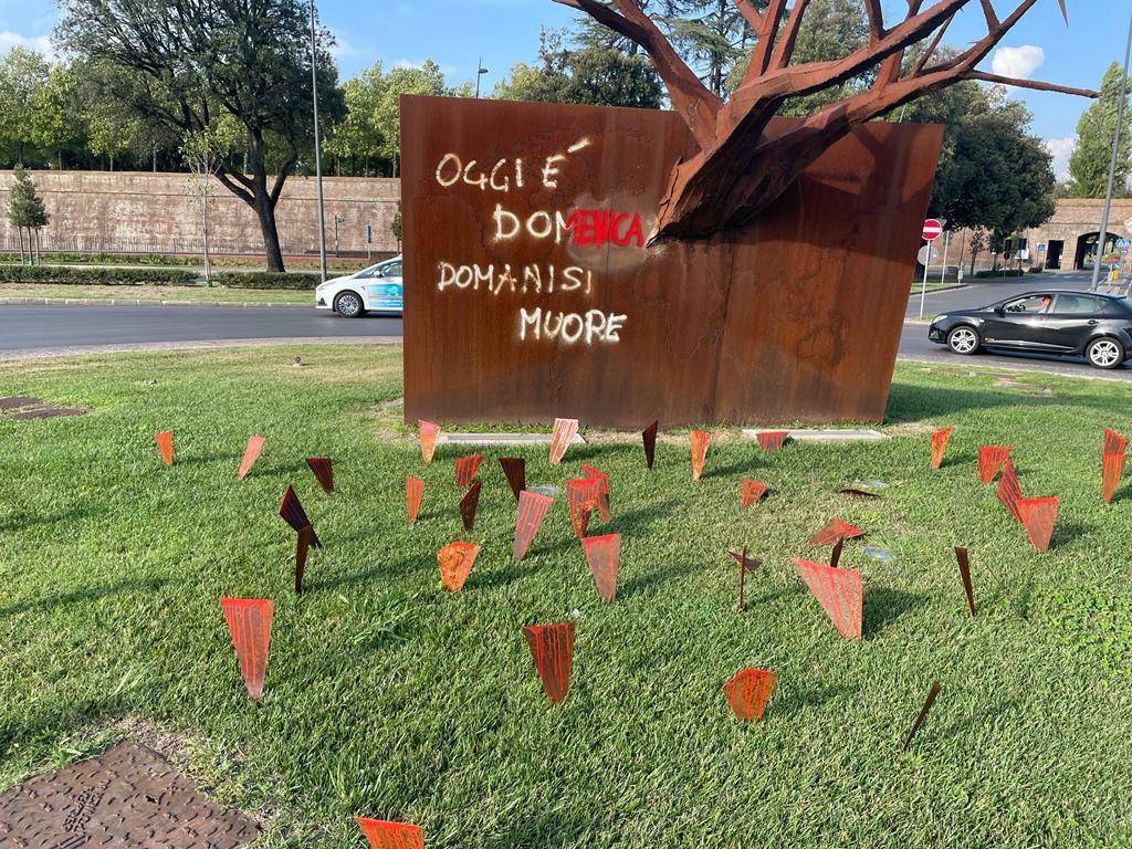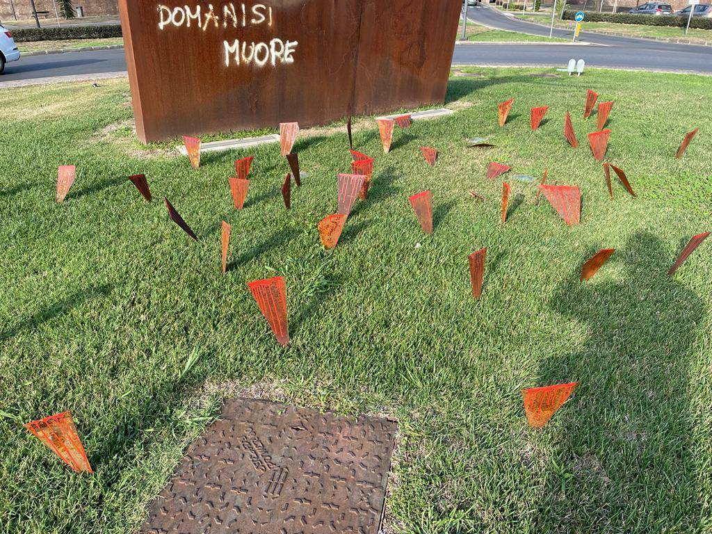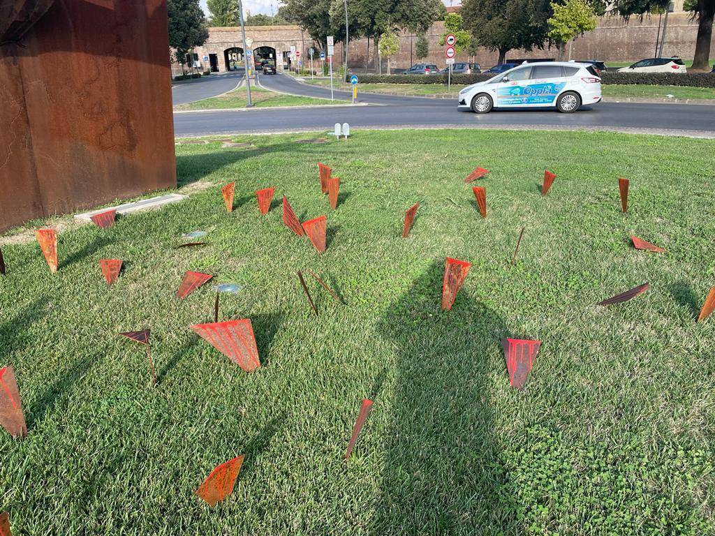 Sì, perché Lucca, ormai, ha il suo monumento Pulp, chi lo avrebbe mai detto? Dopo che l'autore dell'opera finanziata con 80 mila euro dalla Fondazione Carilucca ha infilato le foglie dell'albero di metallo nel prato adiacente il monumento, appare evidente a tutti che si ha a che fare con una persona che definire imprevedibile è un eufemismo. Prima ha deturpato la sua stessa scultura asportando le foglie dai rami e nascondendole oltre a verniciare una scritta senza senso. Ora, nonostante la denuncia, ha aggiunto le foglie grondanti sangue: ma stiamo scherzando?