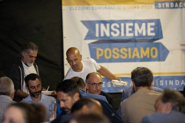 Tutti aspettano che arrivi lui, Enrico Letta, originario di Ghezzano, davvero ad un tiro di schioppo da qui visto che si tratta di una frazione del comune di San Giuliano Terme, proprio di là dal foro. Letta arriva, lo accoglono gli applausi dei commensali-militanti-simpatizzanti-aderenti e lui appare, onestamente, in buona forma fisica, dispensa saluti e strette di mano a destra, pardon a sinistra e, fa sapere che prima di parlare preferirebbe buttare giù qualcosa da mangiare. Ci pensa il consigliere comunale e nuovamente candidato Leonardo Dinelli, una bella persona e anche intellettualmente onesto, a improvvisarsi cameriere con indosso quella maglietta che invita a votare Raspini sindaco come se ce ne fosse bisogno e non lo si avesse già compreso. Ecco Dinelli col vassoio per il tavolo a cui siedono i Vip della serata e si parte con delle penne a che cosa non lo abbiamo chiesto, ma individuiamo olive e pomodoro comunque, conoscendo la cucina di queste parti, non abbiamo dubbi: devono essere squisite.